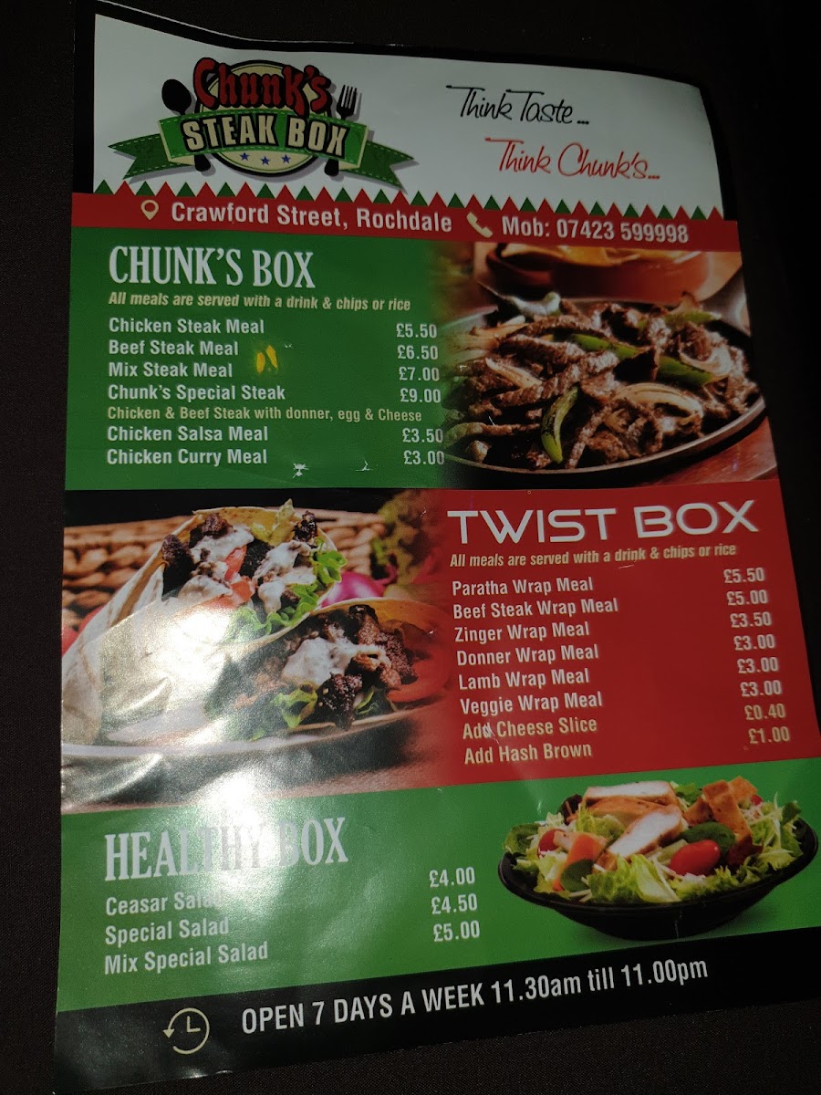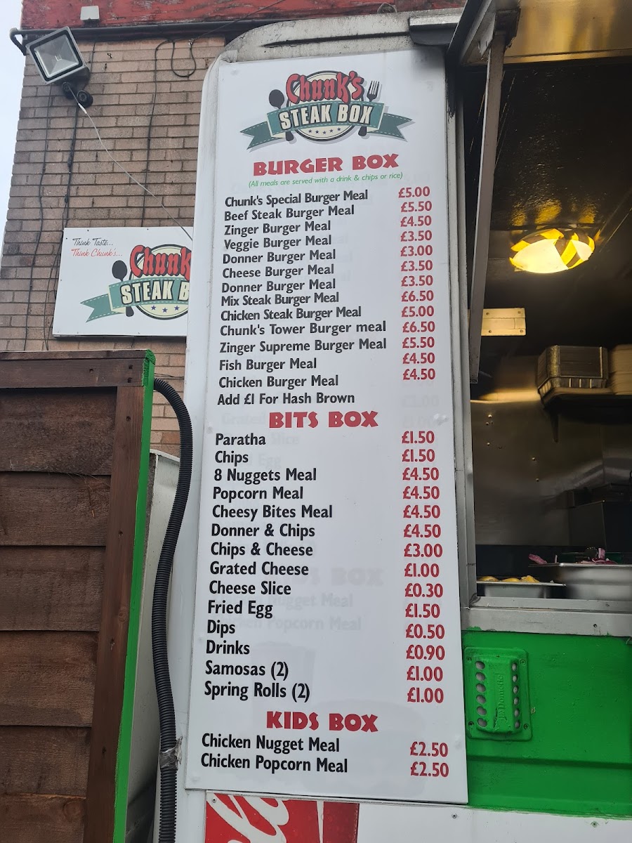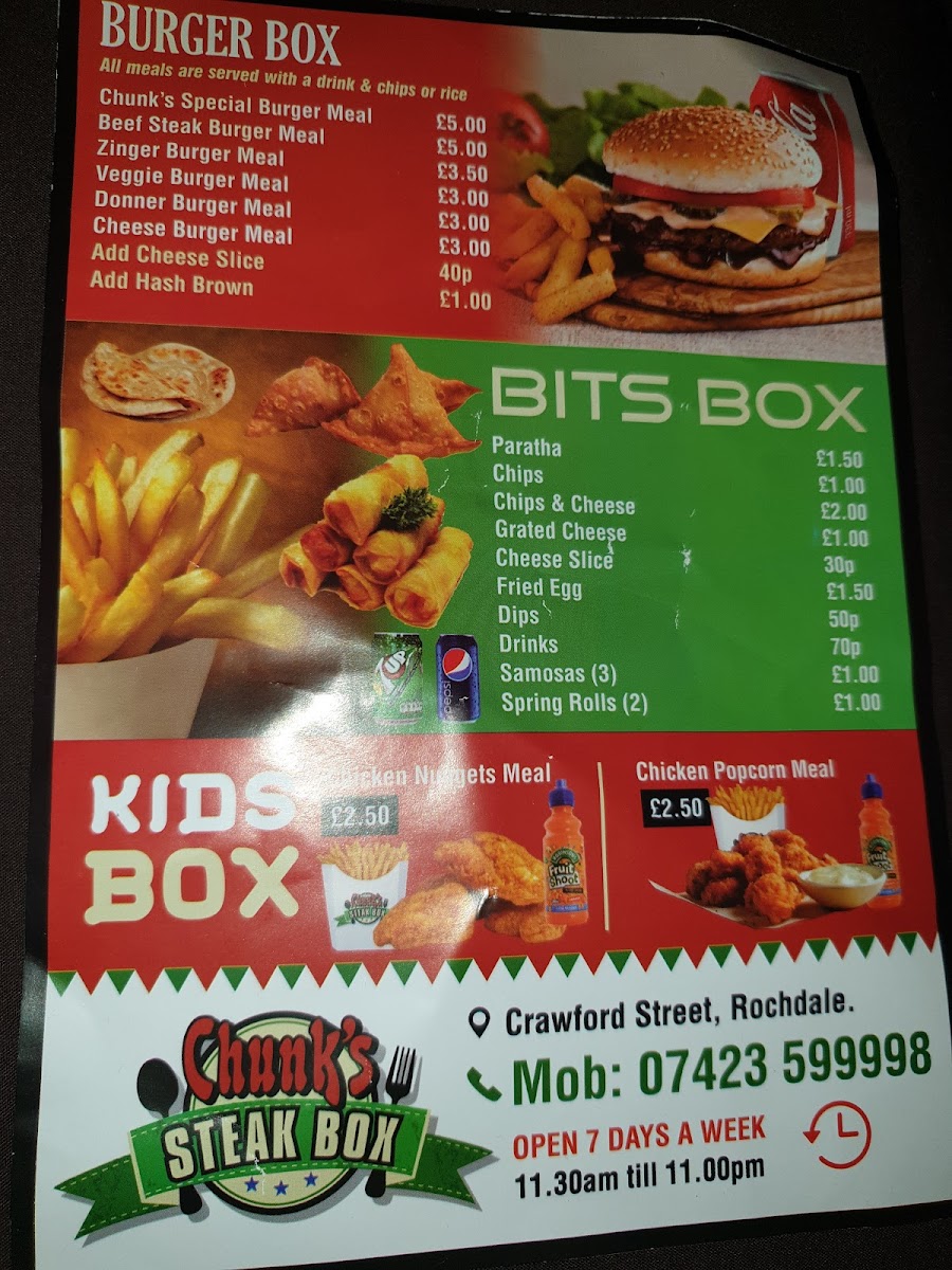 The menu at Chunk's Steak Box in Rochdale offers a variety of flavorful meals that cater to a wide range of tastes. Their Burger Box includes options like the Chunk's Special Burger Meal, Beef Steak Burger Meal, Zinger Burger Meal, Veggie Burger Meal, and Donner Burger Meal, each bringing a unique twist to classic burger offerings. For those seeking lighter sides, the Bits Box is perfect, featuring treats like Paratha Slice, Chips Eg, 8 Nuggets Meal, Popcorn Meal, and Cheesy Bites Meal. The heartier Chunk's Box delivers mouth-watering choices such as the Chicken Steak Meal, Beef Steak Meal, Mix Steak Meal, Chunk's Special Steak, and the Chicken Salsa Meal, all prepared to perfection. If you're craving something more portable, the Twist Box presents a selection of wrap meals like the Paratha Wrap Meal, Beef Steak Wrap Meal, Zinger Wrap Meal, Donner Wrap Meal, and Lamb Wrap Meal. For those looking for something fresh and healthy, the menu also includes Ceasar Salad, Special Salad, and Mix Special Salad. Overall, Chunk's Steak Box offers a diverse and satisfying menu with prices tailored for a wide range of appetites.